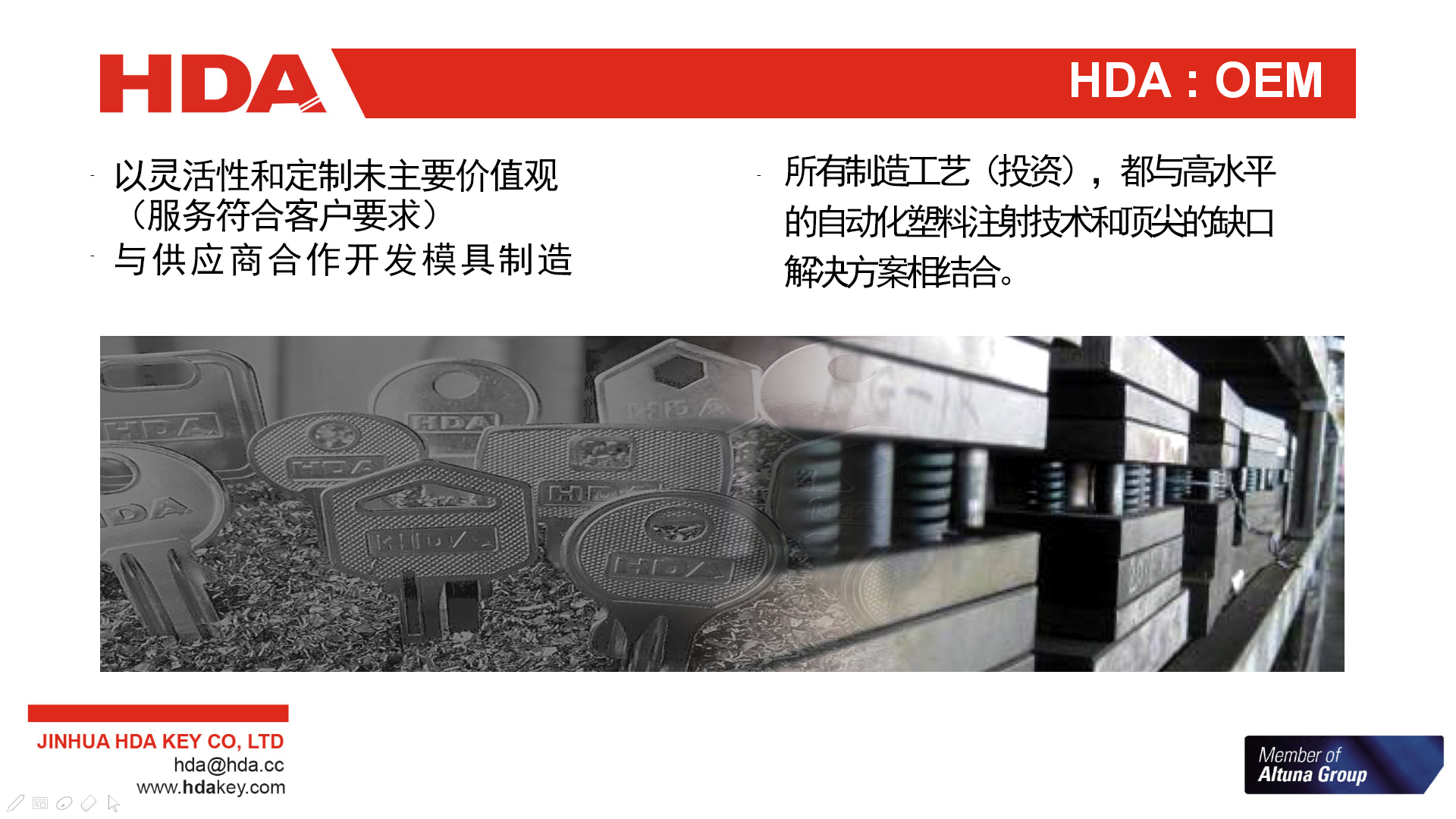 2005年,與歐洲三大鑰匙坯生產企業之一的西班牙JMA集團成立合資公司--金華HDA鑰匙有限公司。 2007年,轉為西班牙JMA集團獨資子公司。